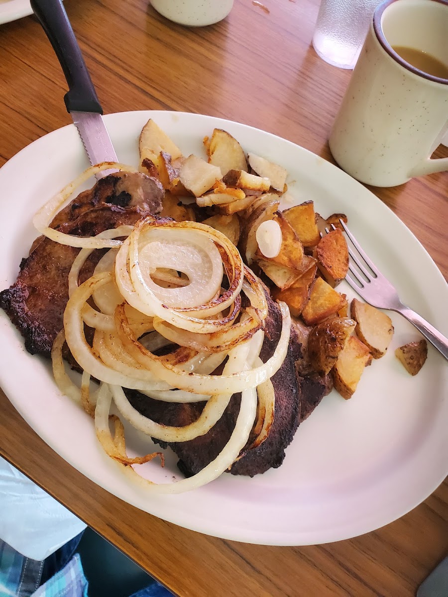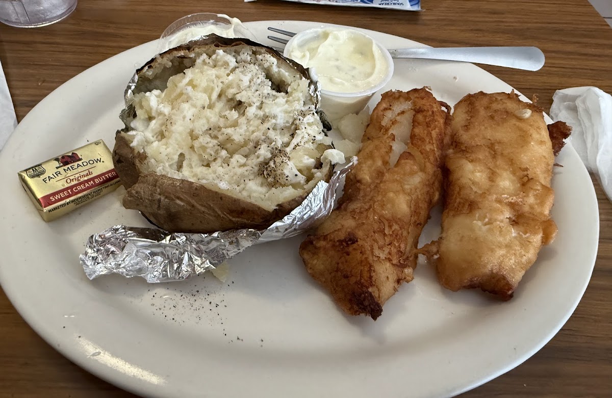 Typical diner / cafe. Friday fish / shrimp fry was terrific and is done all day Friday. I really liked how the shrimp were battered. Came with choice of potato and I did the baked potato with butter and sour creme. Comes with salad bar, which was smaller though sufficient. Note that they bring the fish and shrimp to you and if you want more just ask and they bring more out fresh, which was fine. They brought a huge plate of shrimp last time I asked for a reorder. It's still terrific.